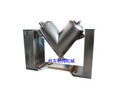 1.V型混合机由两节圆筒对焊而成的混合元件组成。容器旋转时,物料在筒体顶角转向上时分成两股流动,随后顶角又转向下,物料又汇流入顶部,如此反复分割、合并以达到混合。